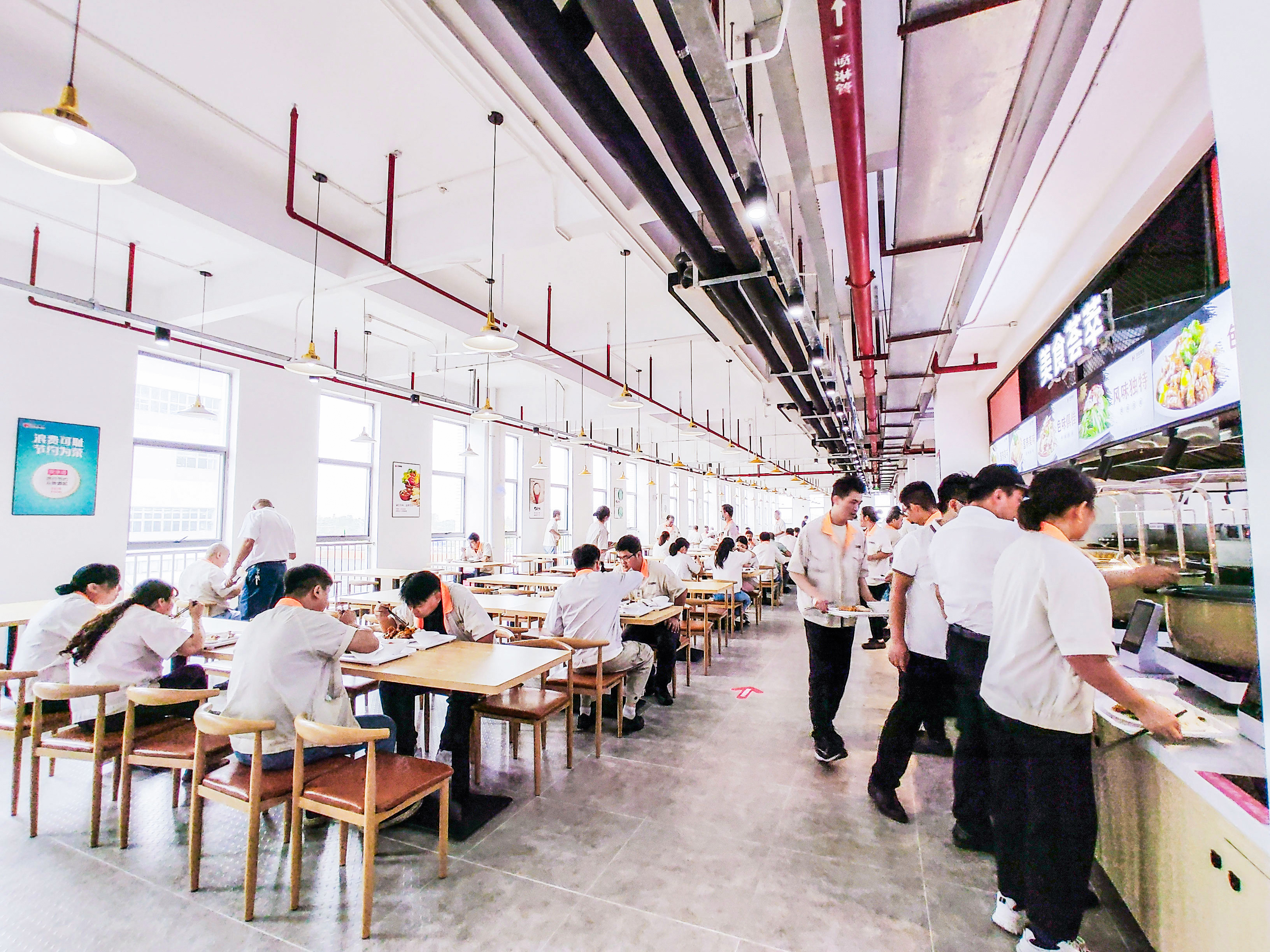 寬大敞亮的餐廳環(huán)境,整個餐廳面積為 1417㎡,開業(yè)當(dāng)天接待超1000名員工及企業(yè)領(lǐng)導(dǎo)就餐,餐廳配置500多個座位,員工分時段就餐,為員工提供寬敞舒適的就餐環(huán)境