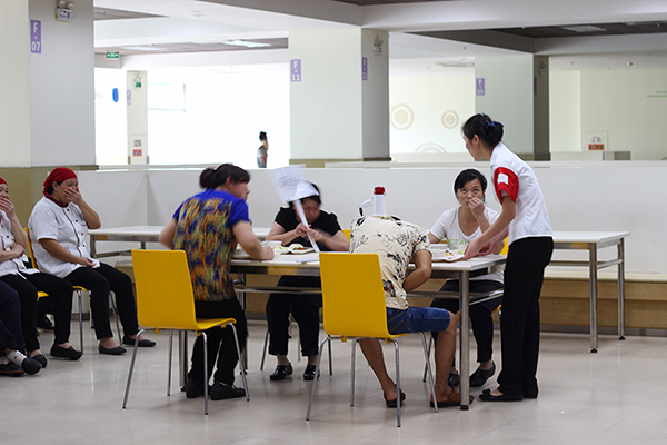 扮演食物中毒的顧客表情逼真、動作生動地演示了食物中毒的情景。當我們在餐廳遇到這種情況該如何處理?這個演練給出了正確答案。