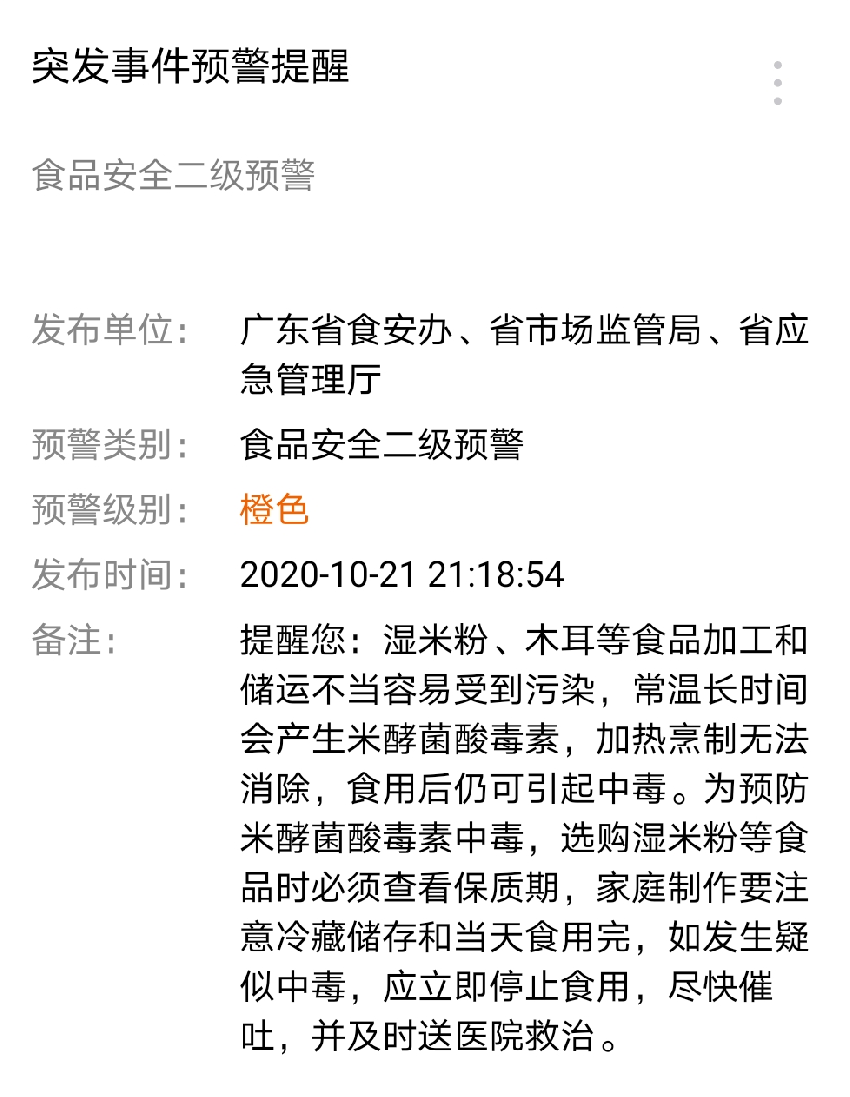 10月21日,廣東發(fā)布食品安全二級預(yù)警,內(nèi)容如下: